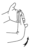 c – Deslize os seus dedos subindo pela sua palma, de forma que a ponta de seus dedos fiquem perto da base deles e você deverá senti-los alongando. Não force os seus dedos com a outra mão caso fique dolorido.
