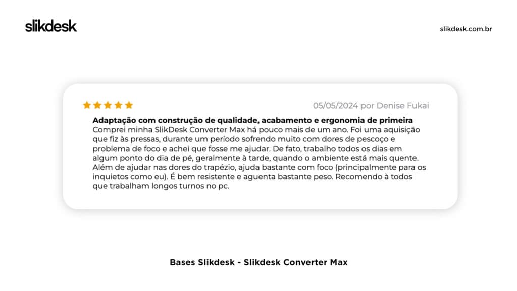 A Slikdesk tem nota máxima (5 estrelas) no Google Avaliações. São mais de 300 avaliações de nossos clientes, que evidenciam toda a qualidade e transformação que nossos produtos proporcionam.