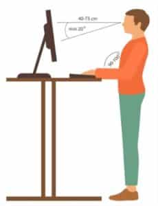 Mesmo que você não meça com exatidão, um cuidado simple é garantir que o monitor está posicionado exatamente na altura dos seus olhos, enquanto seus cotovelos estão rentes aos seu tronco e formando um ângulo de 90 graus entre braço e antebraço ao apoiar as mãos sobre a mesa ou teclado.