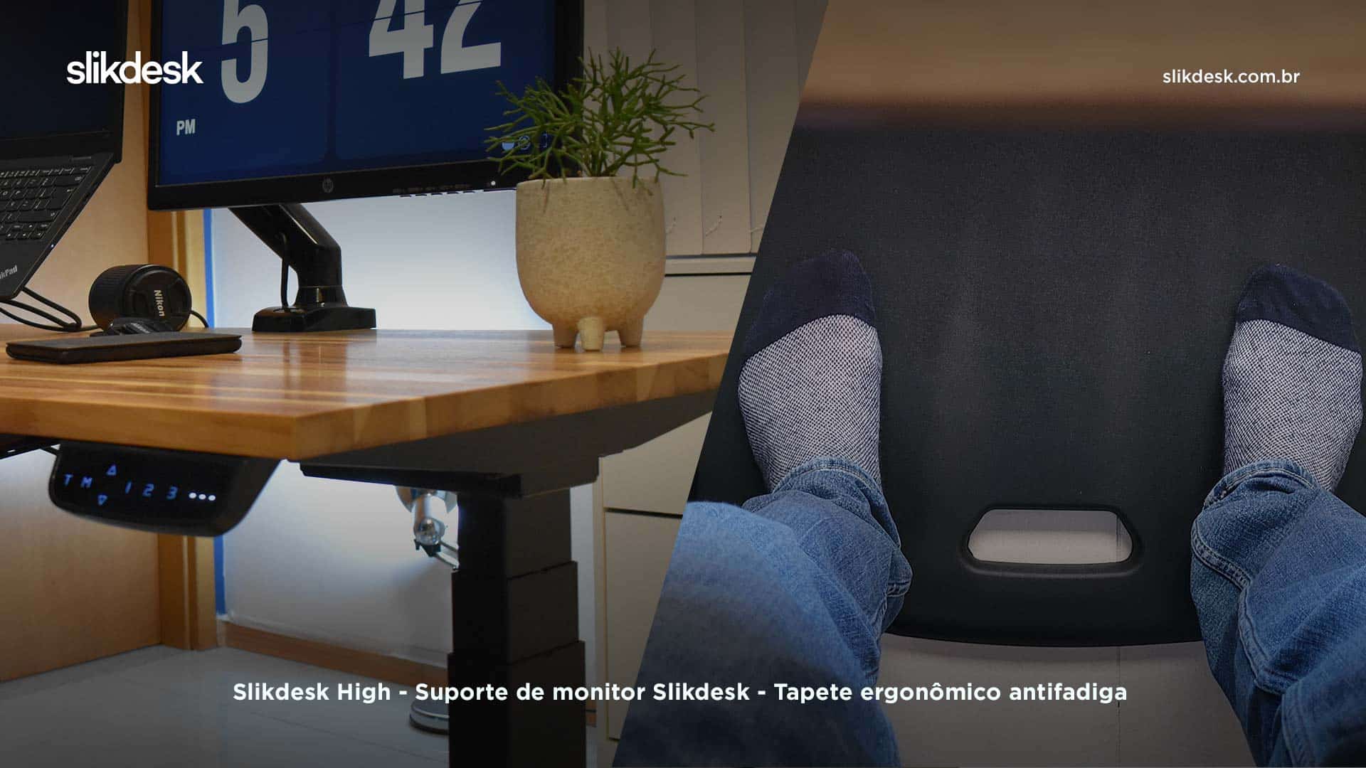 Por fim, ao montar um setup produtivo — onde você pode trabalhar em pé, devido à mesa com regulagem de altura —, também é muito importante garantir uma superfície antiderrapante e confortável para os pés.